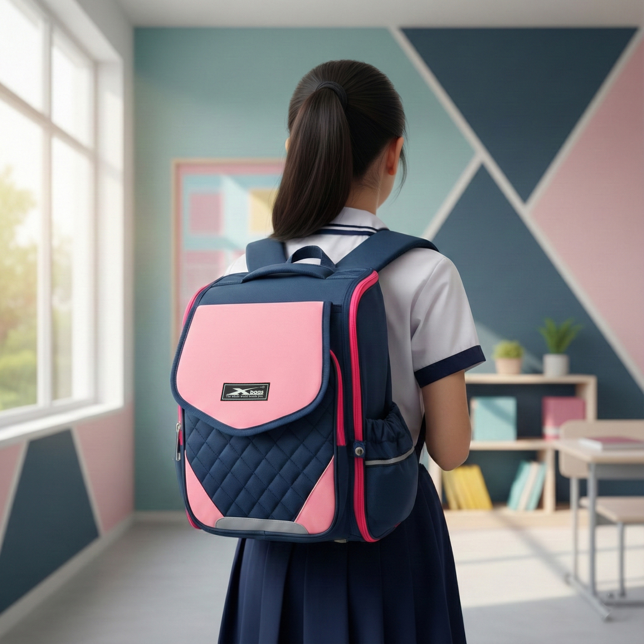 Các bé gái sẽ thích thú ngay từ cái nhìn đầu tiên với tông màu hồng phối xanh đậm tạo nên chiếc ba lô thể hiện sự ngọt ngào, trong sáng, tăng thêm vẻ đẹp hồn nhiên trong từng bước chân bé đến trường