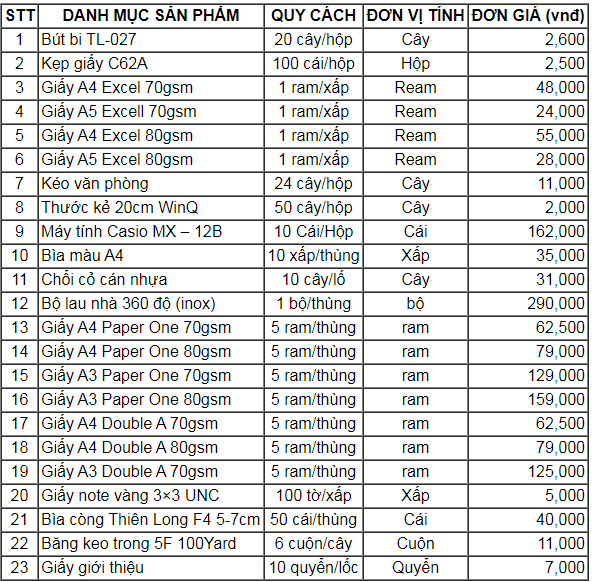 Danh mục văn phòng phẩm excel hỗ trợ báo giá vpp nhanh nhất!
